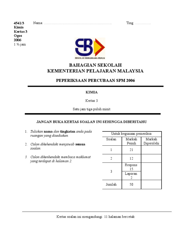 Contoh kertas peperiksaan bahasa malaysia tahun 3 kertas. Kertas ujian kimia tingkatan 4. Koleksi Soalan Latihan Nota Modul Sains Tingkatan 3 PT3 Jawapan 1 M.